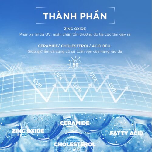 – Zinc Oxide (ZnO): Là màng lọc chống nắng vật lý giúp phản xạ tia UV. Đây là thành phần được đánh giá cao về độ an toàn, đặc biệt phù hợp với da nhạy cảm.