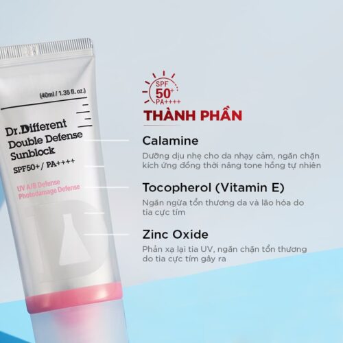 Kem chống nắng nâng tone Dr Different sử dụng 100% màng lọc vật lý, kết hợp cùng chất chống oxy hóa Tocopherol (Vitamin E), mang đến hai lớp bảo vệ vững chắc trước tác động của tia UV và quá trình oxy hóa, giúp làn da được bảo vệ toàn diện mỗi ngày.