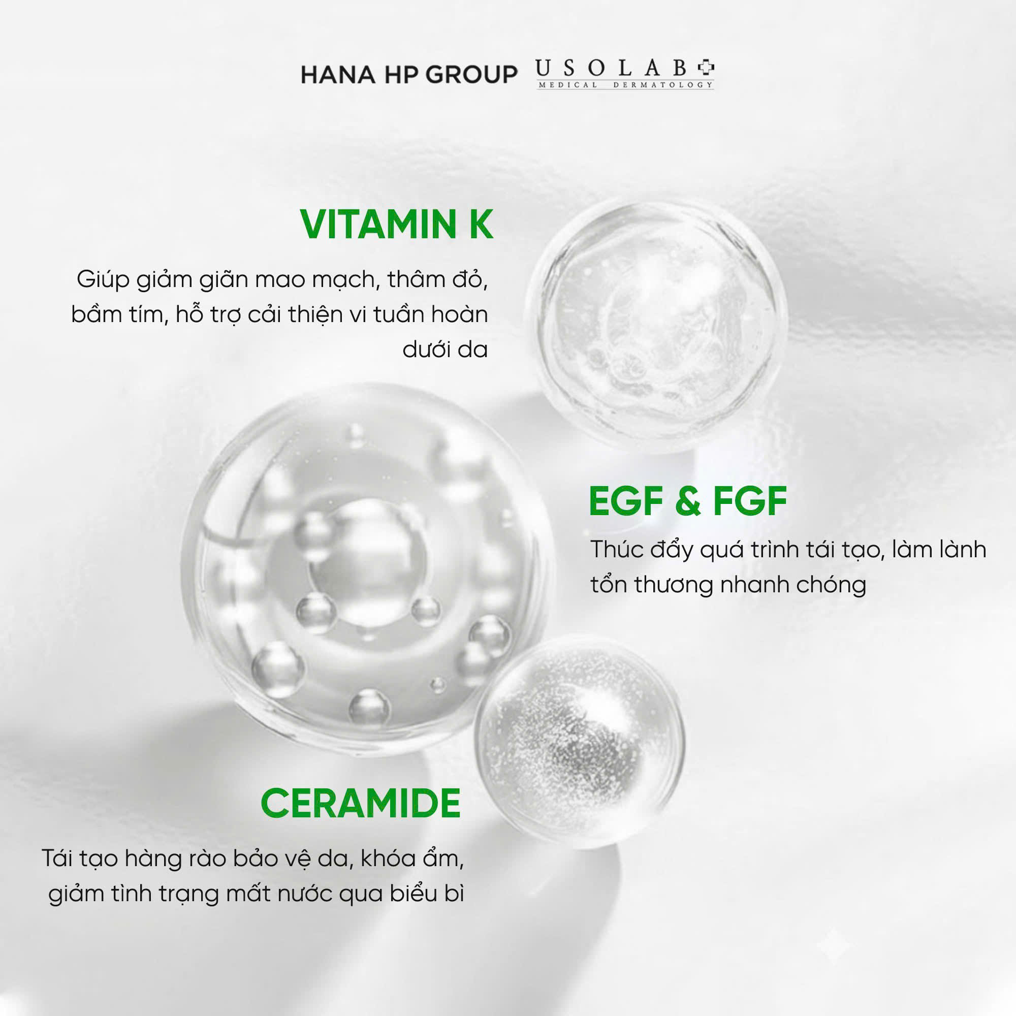 Chuyên hỗ trợ giảm giãn mao mạch, giảm vết thâm đỏ, bầm tím do mao mạch suy yếu, giảm thiểu xuất hiện ban huyết, ửng đỏ, kích ứng sau xâm lấn thẩm mỹ: meso, MTS, peeling, lazer