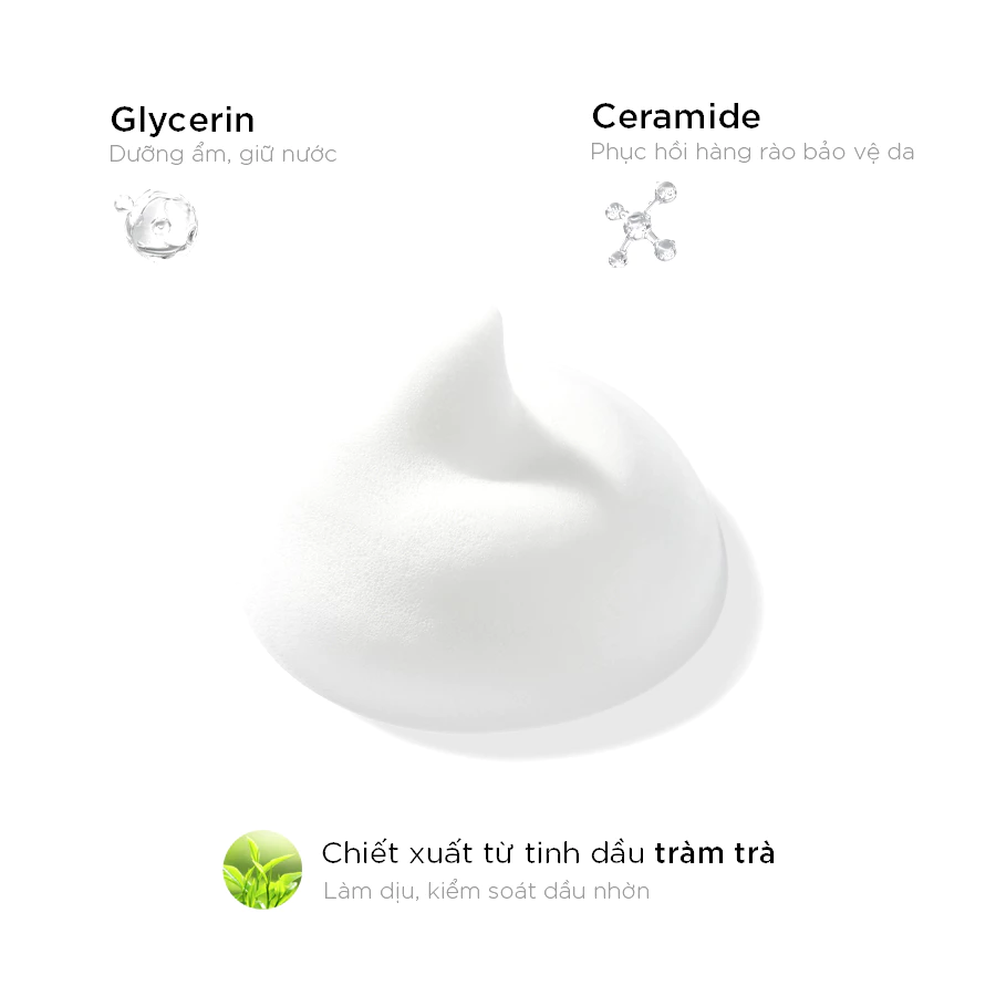 Nước Tinh Khiết, Natri Lauroyl Glutamate, Decyl Glucoside, Glycerin, Dinatri Cacaophodiacetate, Lauryl Hydroxysulfate, Natri Clorua, Natri Citrat, Hydroxyacetophenone, Dipropylene Glycol, Sorbitol, 1,2 -Hexanediol, Axit Lactic, Caprylyl Glycol, Ethylhexyl Glycerin, Axit Citric, Trà Dầu Lá Cây, Natri Hyaluronate, Gluconolactone, Hydroxypropyl Bispalmitamide MEA.